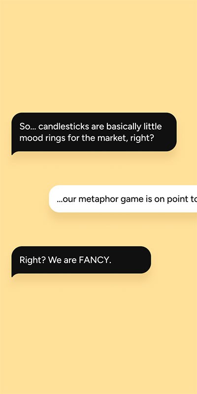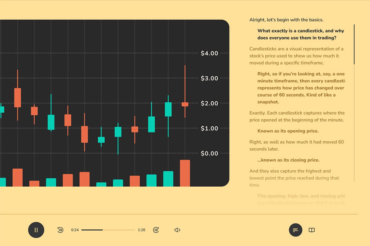 But we still needed to test our lesson format before committing to a full build, and that's where we come back to ElevenLabs and crafting conversations with AI voice. In February 2025, we took our working curriculum, selected a single lesson as our test case, and built it out as a fully dressed experience to put in front of others and see how our assumptions played out. Below are the first few vignettes from that prototype lesson (covering candlestick charts) to give you a sense of how the final prototyped experience looked, felt, and sounded.