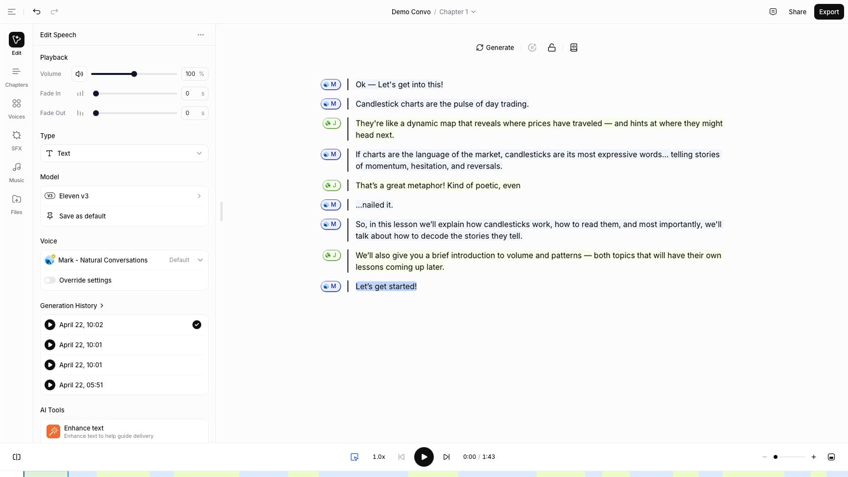 There's a lot more to our prototype lesson than I'm sharing here (it runs about 10 to 15 minutes), but I want to move away from the product discussion and start digging into how I built the experience — and what I learned about crafting conversations along the way. Specifically, I want to cover writing a script, selecting voices, tuning each line to sound human, and editing those lines into a realistic podcast-style conversation.